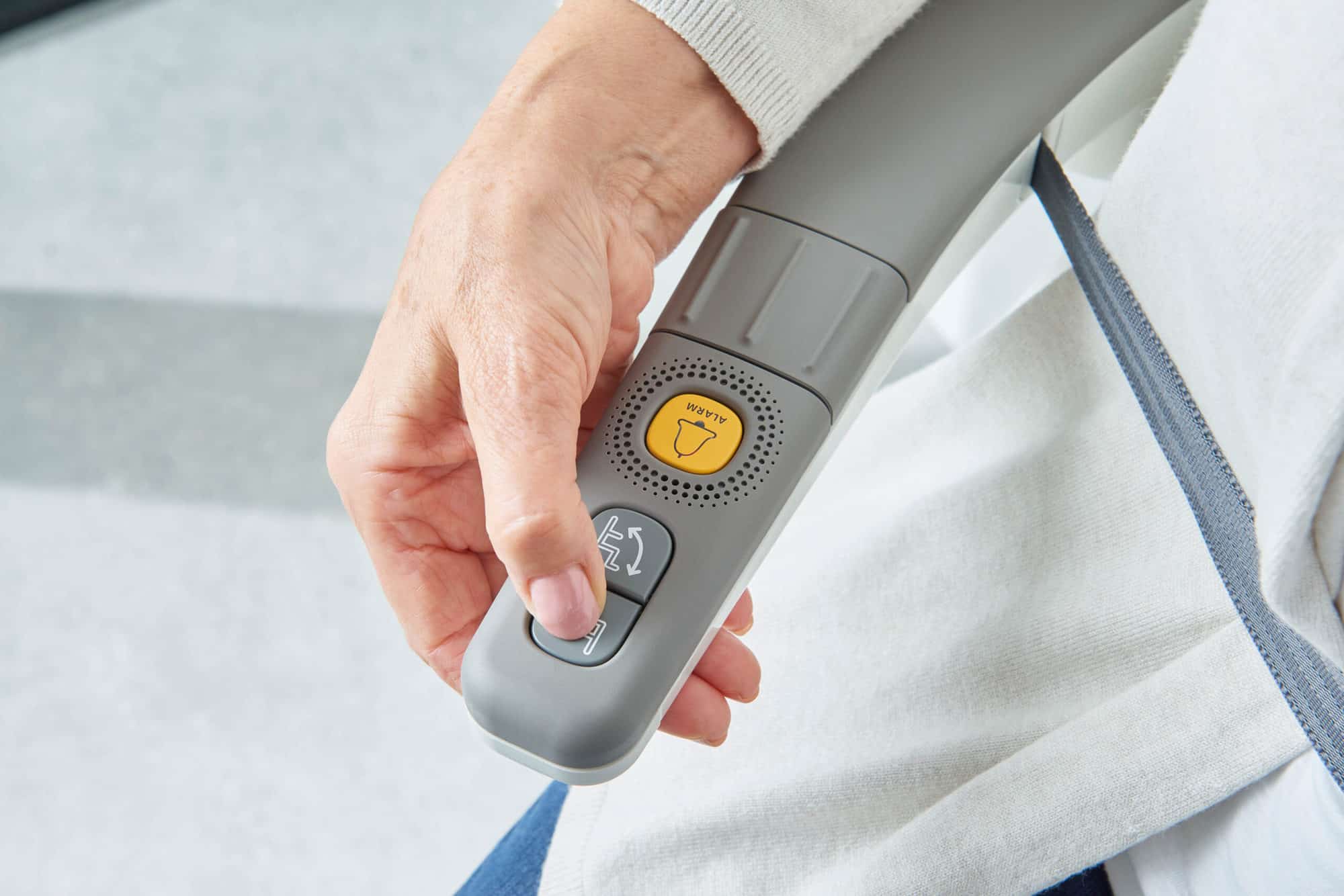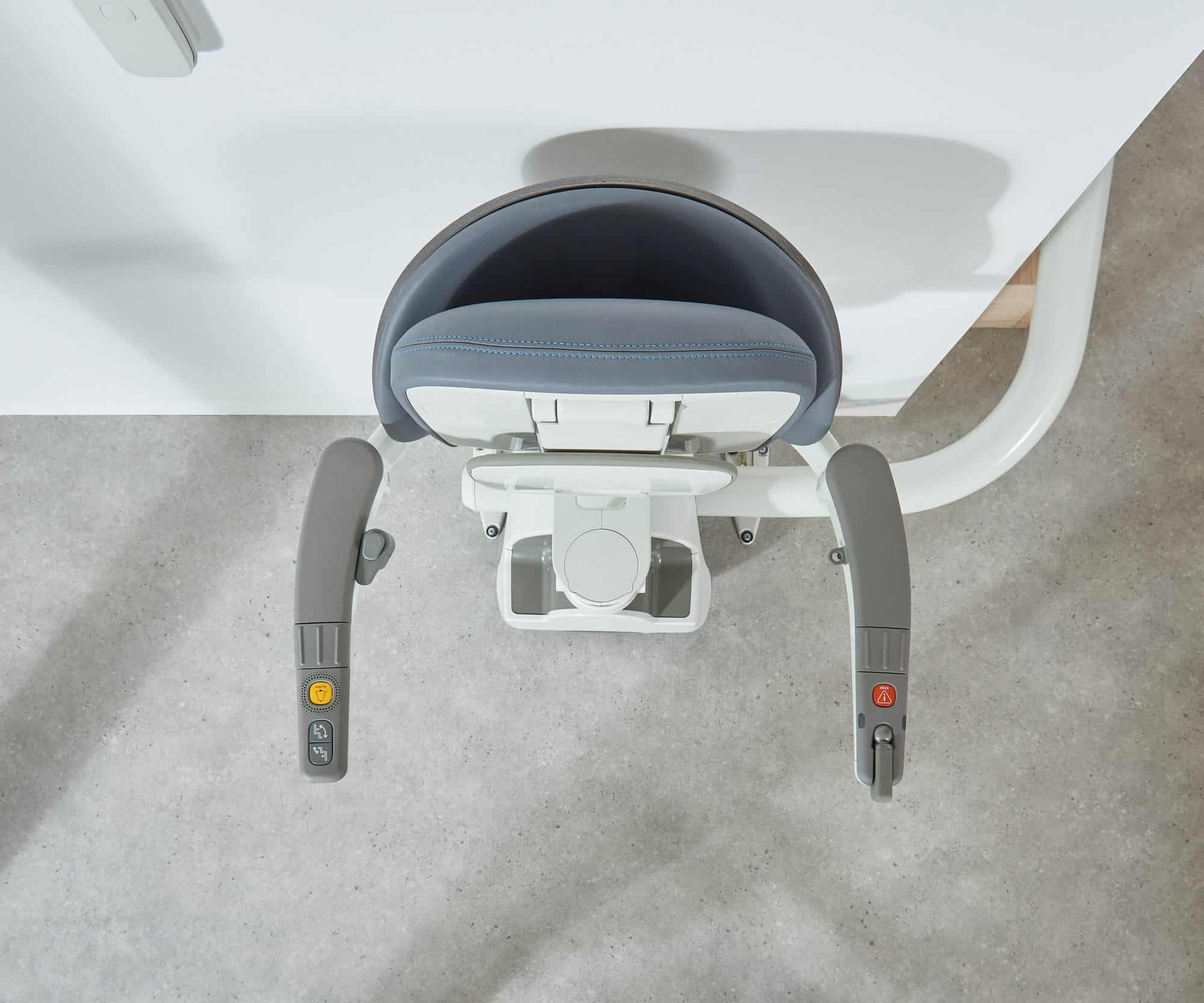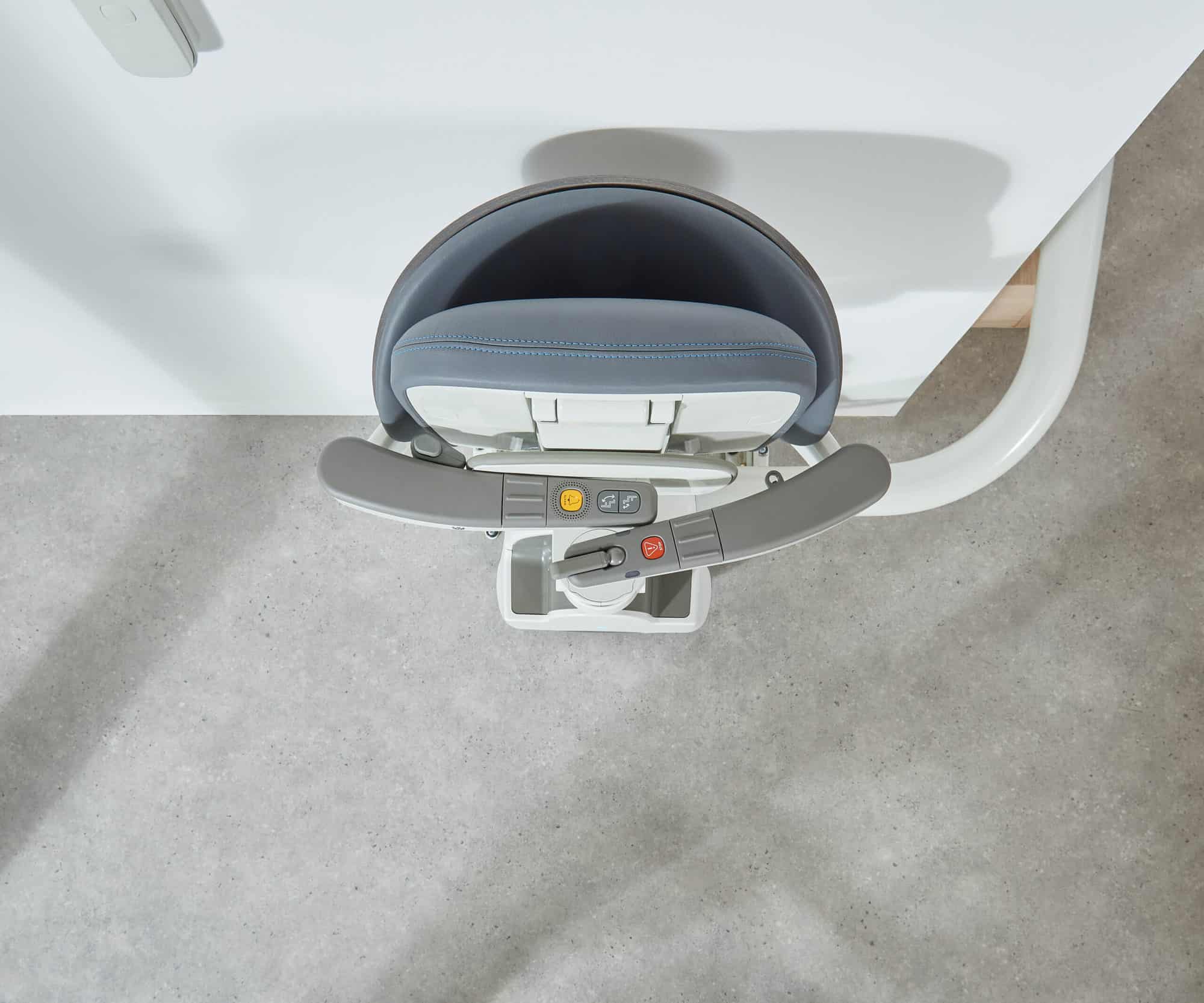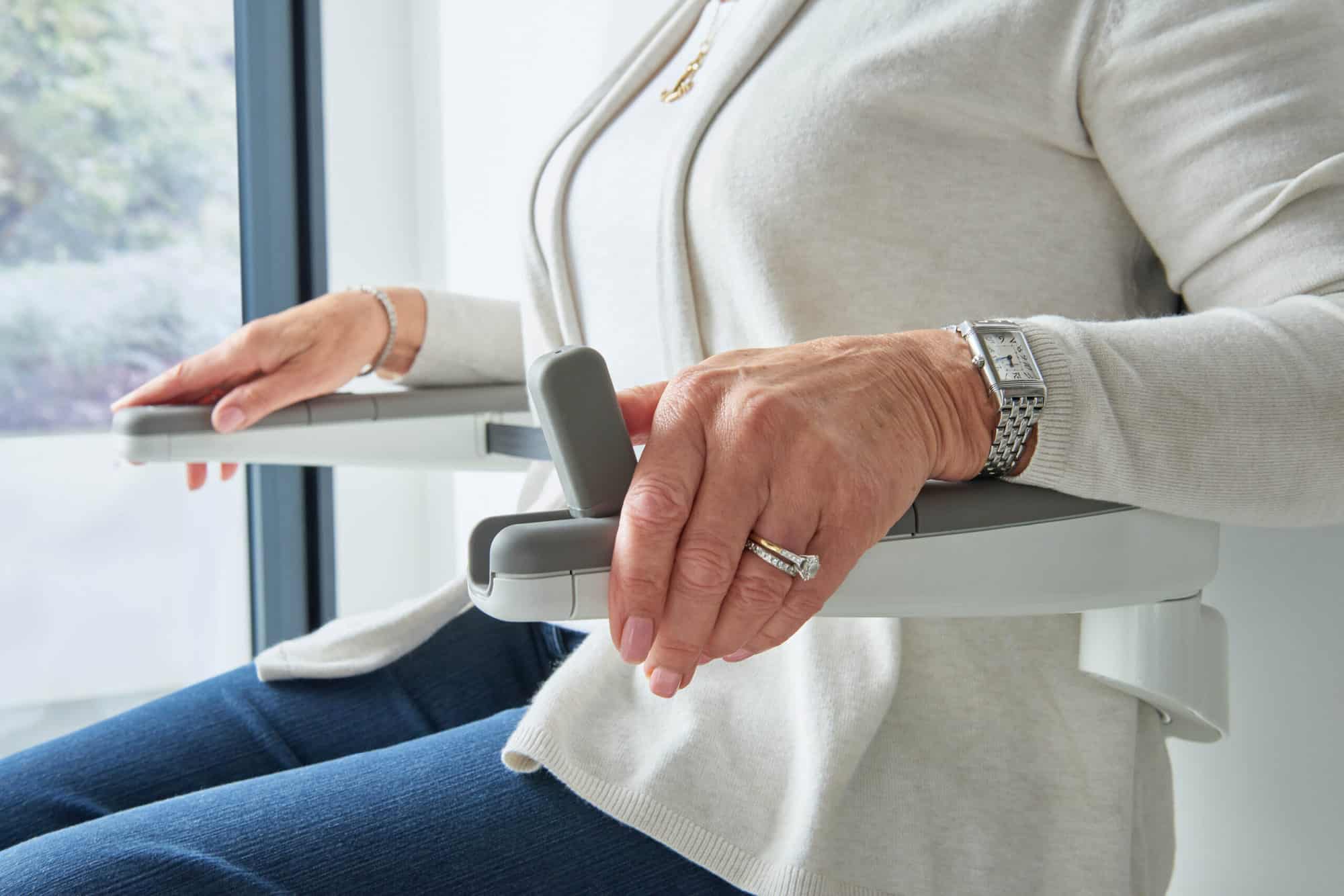 The Flow X stairlift is designed and tested to the highest standards (Machinery Directive 2006/42/EC and EN 81-40), to give full confidence as you move around your home. Flow X’s innovative armrests provide several key benefits. They have an ergonomically-tapered form, designed to give you extra support both when standing and sitting. And thanks to the unique open-access armrest position, transferring to a stairlift has never been easier. Lastly, the smart detection device in the armrests prevents movement when the armrests are not in the correct position, providing full peace of mind